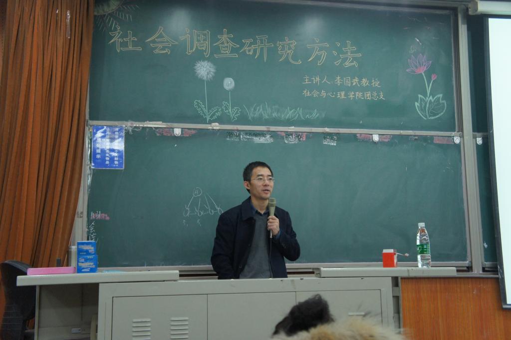 讲座一开始,李国武老师抛砖引玉,举出张三的社会调查来引导同学们了解社会调查中一些常犯的错误,如区群错误、样本过少、主观测量等,在同学们的欢笑中导入本次讲座。