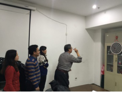 扔飞镖比赛要求选手沉着冷静,保持平稳的身体姿势。有的老师一开始失误较多,旁边有经验的老师则主动提供经验,甚至以身示范,大家始终坚持“友谊第一,比赛第二”的原则,重在体验集体活动的乐趣。扑克牌比赛则更强调队友之间的默契与合作,参赛的老师全神贯注,观赛的老师也看得津津有味。