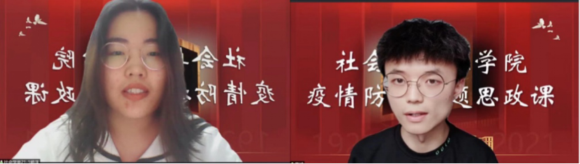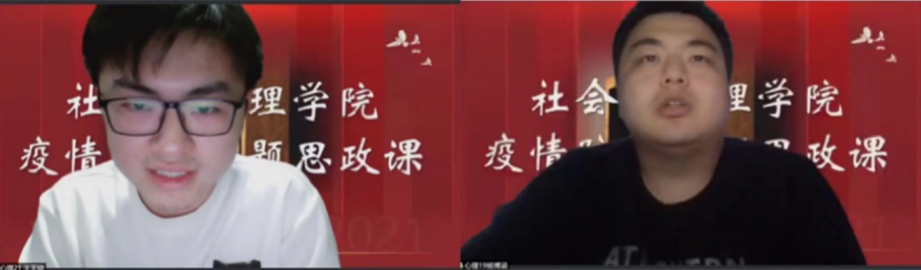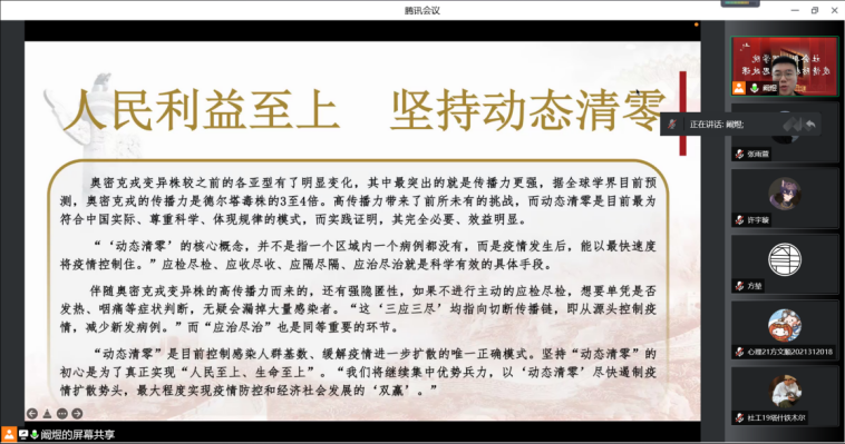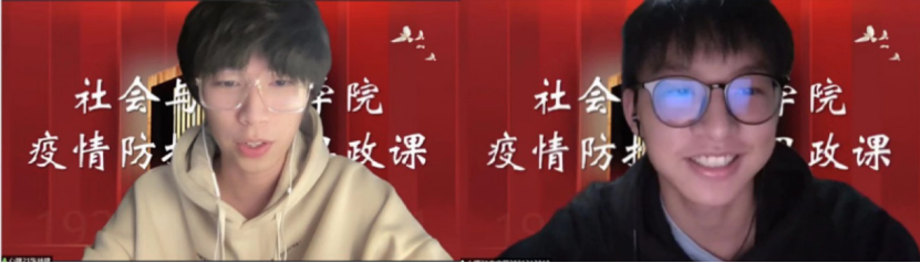 2021级本科生张楚建和2021级本科生方文顺分别分享了在长春和上海处于隔离状态时的感受与心得,他们提到当自己处在疫情中心后,深深体会到五湖四海奔赴而来的志愿者在抗击疫情期间的辛劳与付出。同时两位同学提醒大家要“不信谣、不传谣”,对于网络中来路不明的信息能够保持理智,相信党和政府的疫情防控政策和广大群众的抗疫决心。