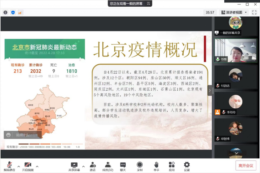 各位老师结合全国疫情发状况,对北京目前的疫情防控形势做了着重的讲解和分析,解读了国家和北京市的疫情防控政策,要求学同学们做好个人健康防护,积极配合学校和所在地区疫情防控政策,主动接种疫苗,做好核酸检测,已返校学生五一假期期间“非必要不出校”,严格遵守北京市和学校的防疫管理规定。做好个人防护与管理。