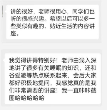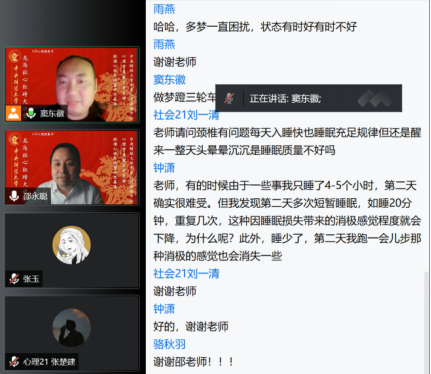在讲座分享结束后,邵永聪老师对同学们关于睡眠质量的研究范式、睡眠拖延行为和睡眠质量等相关问题进行了回答。通过本次讲座,同学们从心理学的角度对睡眠问题有了更为深入的了解。本次讲座受到了老师和同学们的热烈反馈,再次感谢邵老师带来关于睡眠的主题分享,也欢迎各位继续关注“龙马社心红砖大讲堂”和大学生心理健康节系列讲座!