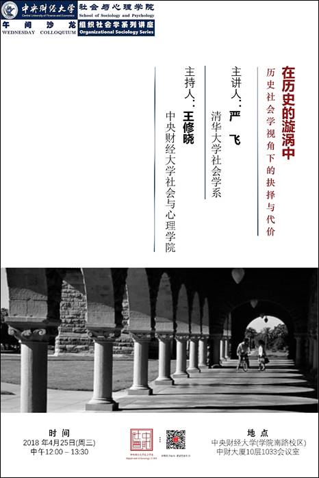 BB贝博艾弗森官方网站午间沙龙2018年春季学期第四期,暨“组织社会学系列讲座”第一讲,邀请到清华大学社会学系严飞副教授,分享《在历史的漩涡中:历史社会学视角下的抉择与代价》。欢迎各位老师、同学和朋友参加!