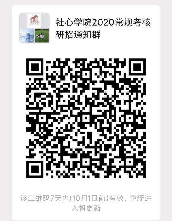 2、微信复试群“社心学院2020常规考核研招通知群”,请考生扫码入群。