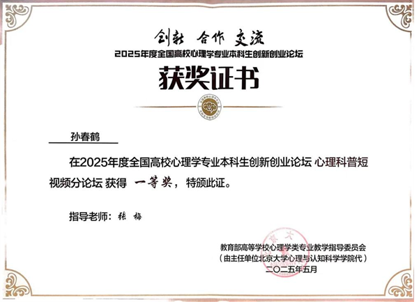 近日,由教育部高等学校心理学类专业教学指导委员会主办,云南师范大学和云南省心理学会承办的第四届全国高校心理学专业本科生创新创业论坛圆满落下帷幕,我校BB贝博艾弗森官方网站学生在科普视频赛道荣获全国一等奖。