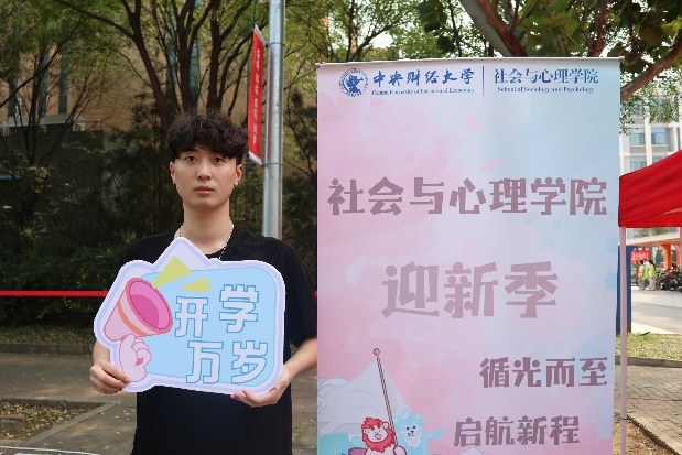 报到现场特别设置了合影留念区,新生们手持创意标语牌在学院展架前拍下入学纪念照,记录下成为“社心人”的第一抹光影。