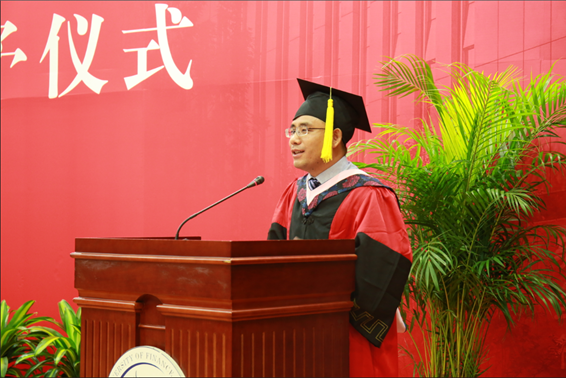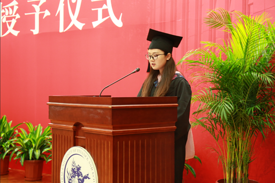 在之后的致辞环节中,15级学硕余小霞同学,社工14王晓蝶同学分别代表研究生、本科生毕业生发表毕业感言,向曾经培育并给予他们无限关怀与支持的学院领导、老师、家人和朋友们表达了最诚挚的感谢,深情回顾了中财求学时光里的点点滴滴,并向大家分享了大学的诸多收获和对学院和同学们的真挚祝福,表示在未来的日子里,将秉持端行正悌,学为人好的精神,在通往“信爱知行”的道路上不断奋斗、努力进取,续写社心人、中财人更绚丽的篇章。