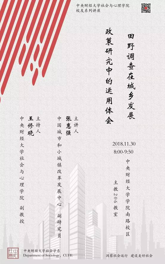 2018年11月30日早8:00-10:00,学院南路校区主教206教室,BB贝博艾弗森官方网站社会学系2018年度校友系列讲座,邀请到中国城市和小城镇改革发展中心副研究员张惠强老师,做了题为《田野调查在城乡发展政策研究中的运用体会》的精彩讲座。讲座由社会学系王修晓老师主持,社会学系艾云老师、2018级社会学本科全体新生,以及其他年级的部分研究生和本科生共60余人到场参与。