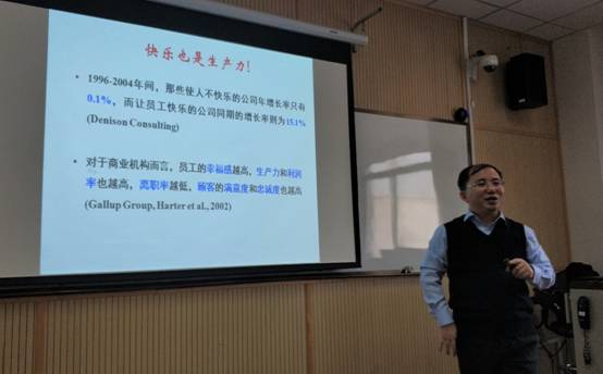 陆老师还介绍了他的研究团队在工作重塑、思乡等领域所进行的一些非常有创新性的工作,这些研究结果表明,在工作情境具有高度不确定性的情况下,员工能够发挥主观能动性进行工作重塑、积极应对,离家工作的员工会因为想家而损害工作资源。最后陆老师总结“快乐也是生产力”,员工的健康和幸福与组织的繁荣和发展密切联系在一起。陆老师的研究既有严谨创新的理论高度,也有敏锐现实的应用价值,使在场所有老师及同学们更为深刻了解职业健康心理的使命,也为大家生动地展示了心理学研究的魅力。