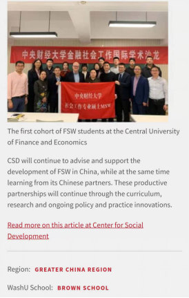 2019年12月16日,美国圣路易斯华盛顿大学在其官网刊登通讯,报道了该校布朗社会工作学院、社会发展中心杰出教授迈克尔·谢若登教授和中心主任邹莉女士不久前中国学术之行的相关活动。这篇报道重点介绍了两位专家受邀参加由我校BB贝博艾弗森官方网站举办的“金融社会工作国际学术沙龙”的相关内容,在海内外社会工作学术界和教育界引起了不小的反响。