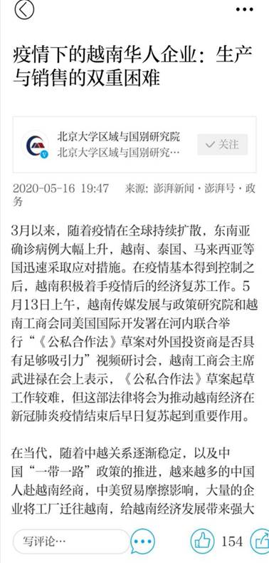 最近,BB贝博艾弗森官方网站2019级社会学专业硕士研究生安倩撰写的《疫情下的越南华人企业:生产与销售的双重困难》发布于“澎湃新闻·澎湃号·政务”中的“再看世界”(Area Observer)专题中。文章由该生导师包胜勇副教授指导。5月份以来,越南的疫情基本得到控制,越南政府积极着手疫情后的经济复苏工作。疫情下在越南生活的华人生活工作状况也引人关注。在安倩同学的越南疫情观察报告里,介绍了两位在越南发展的华人的经历和所见所闻。文章以小见大,引导读者深入了解疫情下越南华人企业的生存困境。