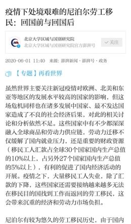 此前,苏建鹏同学于4月底在同一专题发布题为《疫情之下的尼泊尔:日常生活与隐忧》的文章,其中曾简要提及疫情对劳工移民的影响。5月中旬以来,尼泊尔和其劳工移民的主要目的地国家——印度、卡塔尔、沙特阿拉伯、科威特等,确诊病例不断增长,劳工失业、防疫、生存等问题更为突出,关于被困海外的劳工移民的报道也不断增多。在此种情境下,他结合相关文献和各网站提供的数据资料,较为详细的分析了尼泊尔劳工移民在疫情下的艰难处境及其原因,并提出简要对策。