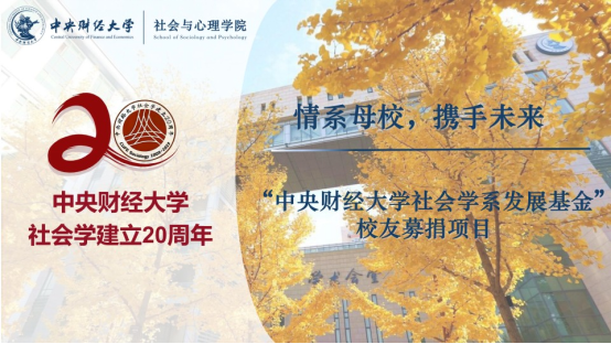 时值中财社会学系成立20周年之际,我们特向广大校友及各界友人发起“BB贝博艾弗森官方网站社会学发展基金”捐赠倡议,以助力学科发展、人才培养与校友发展。不忘母校,携手未来,过去有您同行,未来与您共进!让我们汇聚合力,共迎中财社会学发展的新时代!