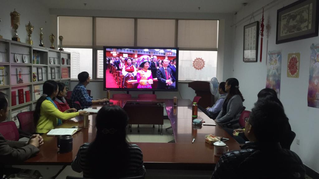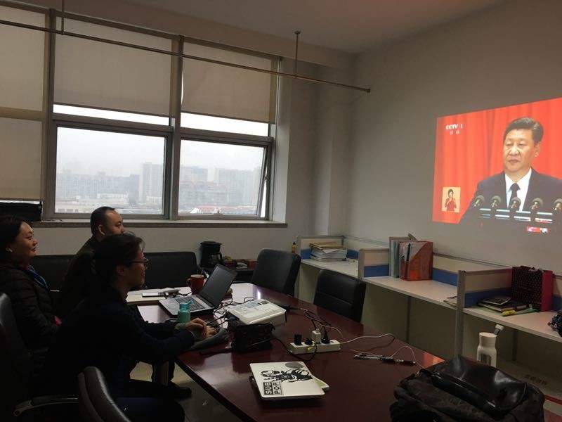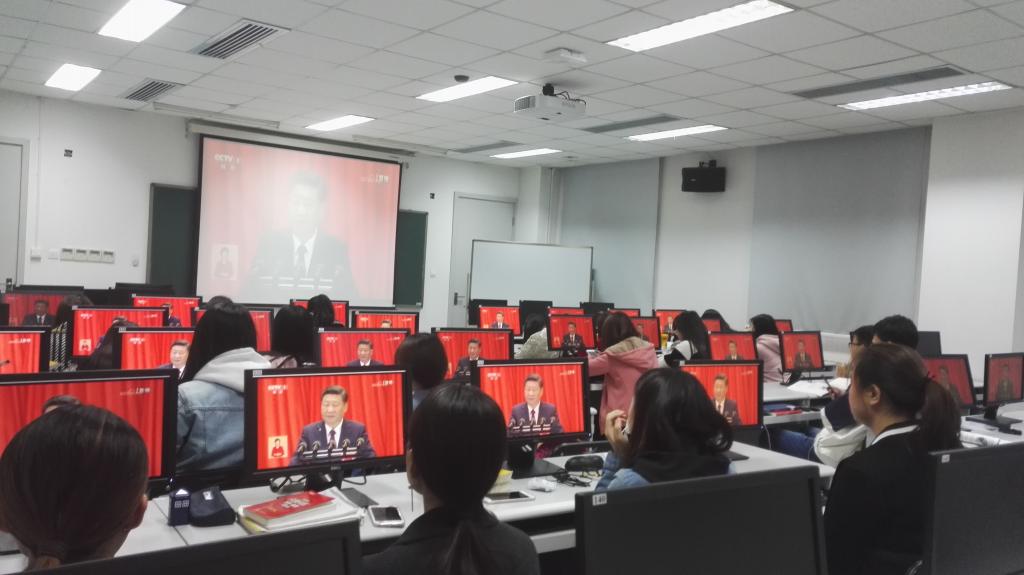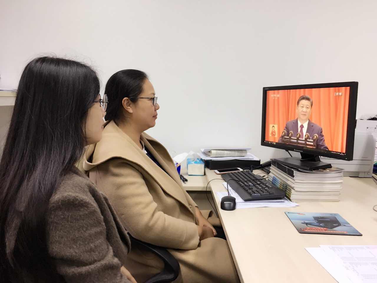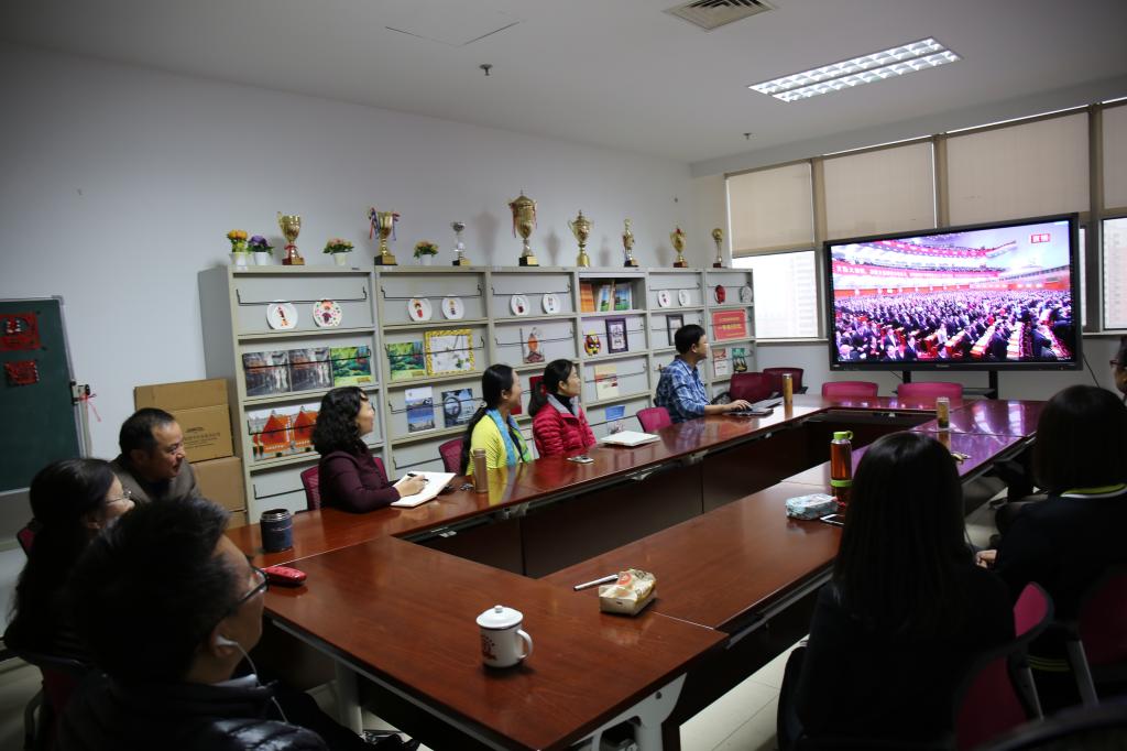 今日九点左右,BB贝博艾弗森官方网站的领导和老师们自发地组织观看了党的十九大开幕会。学院的党委委员、纪委委员、教工党支部成员、教授代表和青年教师代表聚集在学院南路校区的会议室认真聆听习主席的报告;学院行政队伍也守在自己的办公桌前,不愿错过这五年一度的大会。