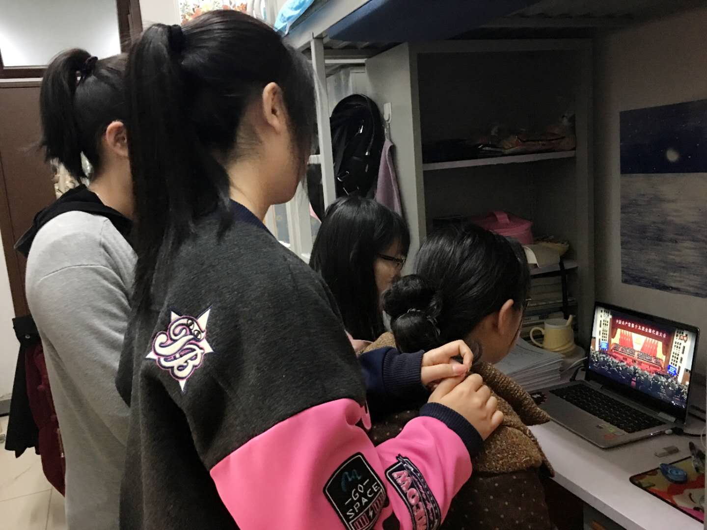 与此同时,经济心理学17班的同学们自发在宿舍的电脑屏幕前收看这激动人心的时刻,认真学习习近平总书记讲话。