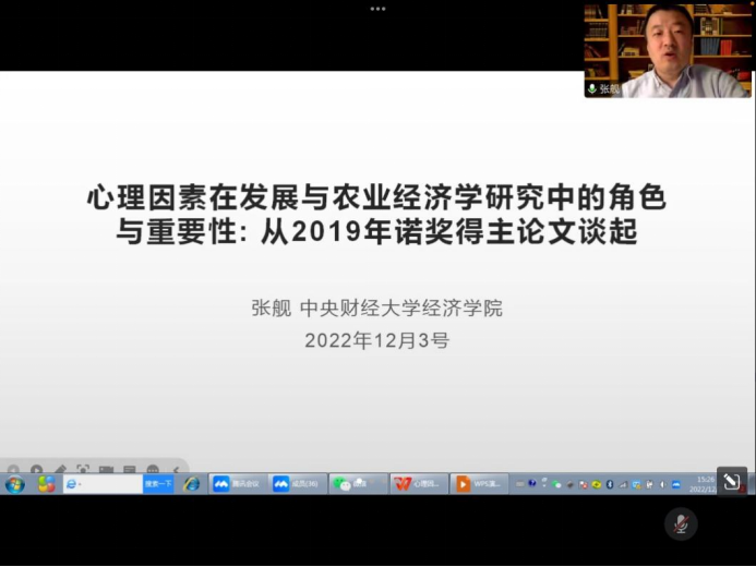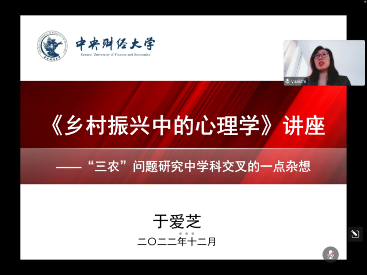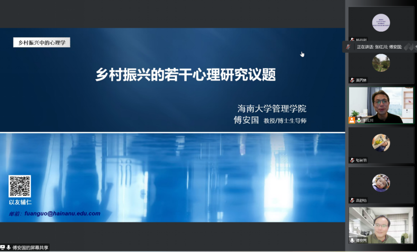 BB贝博艾弗森官方网站立足我国乡村振兴实践中面临的实际问题,统筹组织,集结优势研究力量,积极践行乡村振兴战略一方面组织精兵强将,投身我校乡村振兴的科研与实践工作,另一方面也以此为契机,挖掘课程思政元素,加强研究生课程建设贝博张红川副教授,自2021年起开始组织并实施乡村振兴中的心理学工作坊,为高等院校参与乡村振兴实践探索可行的路径2022123日,22级心理学研究生工作坊《乡村振兴中的心理学》在线上举行。该工作坊由贝博张红川副教授担任主讲人,邀请了北京师范大学黄四林教授、海南大学傅安国教授、BB贝博艾弗森官方网站于爱芝教授与张舰教授,围绕乡村振兴这一现实问题,从心理学与经济学相结合的角度,各自提出了自己的真知灼见。贝博32位学术研究生与专业研究生,以及多位教师参加了本次工作坊。