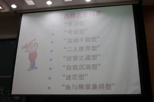 随后便是对大学生的几种心理状态的分析:为了考研出国的学习型,为了考试而考试的考试型,只顾参加活动而忽略学习的社会活动型,只顾谈恋爱的二人世界型,爱情学习都把握很好的两全其美型,完全没有规划的迷茫型等等。