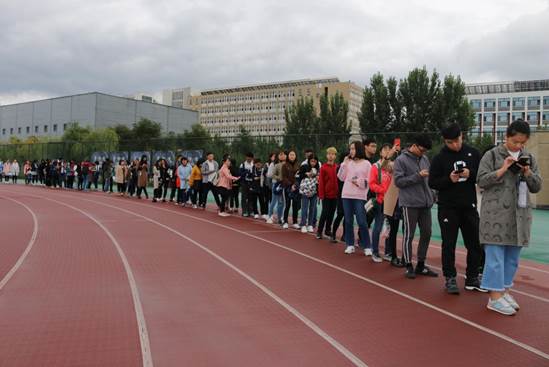 周五下午,同学们在操场上等候医师的检查。医师们依旧认真负责,查看每一位同学的手臂红肿情况。