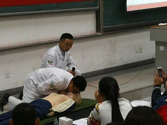 来自999急救中心的金老师以及其他老师,用幽默生动的语言和动作,为我们讲授了一系列应急救护措施。首先为我们介绍了国际救助的优先选择,接下来为我们讲授了紧急情况下止血,包扎,固定,搬运的处理方法。并让在场学习的每位同学亲身体验学习了三角巾和绷带的使用方法。最后还为我们传授了心脏复苏的操作手法,速效救心丸的使用方法,中风的处理方法,被异物卡住喉咙时的海姆立克急救法。通过此次应急救护培训的学习,每一位同学在亲身学习急救知识的基础上,更了解了掌握急救知识对于广大人民群众的重要作用。