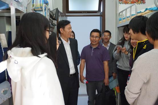 29号早晨,书记及老师们一路谈笑风生,来到了学生宿舍6号楼BB贝博艾弗森官方网站124女生宿舍。初入宿舍楼,傅书记首先赞扬了我校学生宿舍的设备条件,并笑谈起当年他在中山大学的十人间宿舍。随后书记进入124宿舍,亲切地询问了宿舍四位女生的家乡地,并关心她们是否已经习惯学校的新生活和新环境,使她们心中倍感温暖。