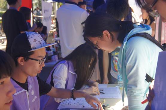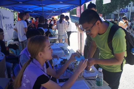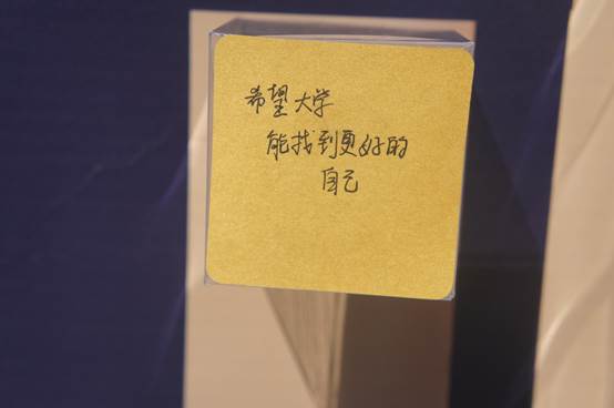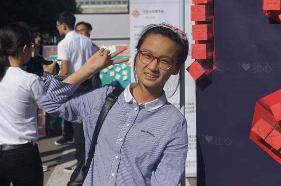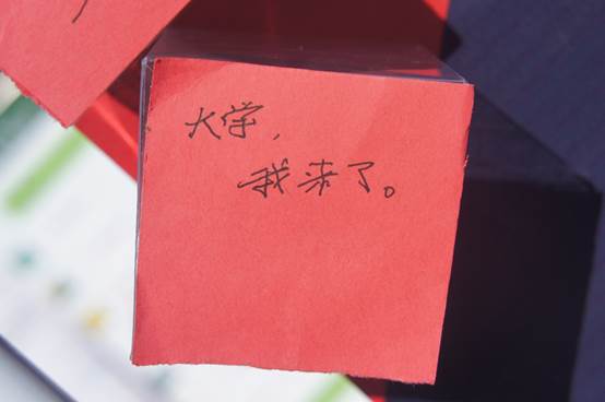 在确认好新生的基本信息后,迎新志愿者会将开学报到的资料一一交递给新生并详尽地告知新生报到流程。社心学院今年独出心裁地设计了“魔方拼图”环节,新生每人都有机会抽取到学姐学长精心准备的天使礼物一份,在抽取礼物之后,可在透明小盒有贴纸的一面写上自己对新学期的寄语,将这些小盒沿着易拉宝的院标一路贴下,拼凑出了立体的青春社心。