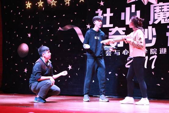 由心理16的同学们带来的情感剧掀起了晚会的一波小高潮。一班同学,两位主角,三段穿越,四季相随。没有了“十里”桃花,便不存在凋落,只有永恒的刘VIP与赵欣理。桃花十里,都不如你。