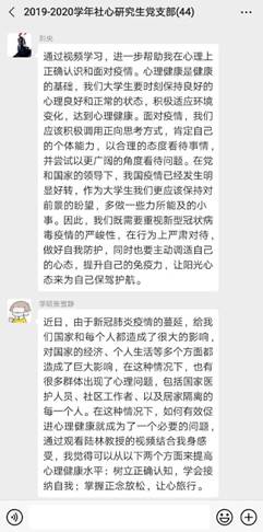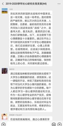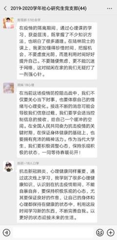 在党支部书记吴梦诗同志的组织之下,BB贝博艾弗森官方网站研究生党支部全体党员充分利用学习强国等媒体平台,自行学习《新冠肺炎疫情下大学生心理健康的促进》,并鼓励每位学生党员记录自己的学习心得感悟与大家进行分享,从而使每位党员都能树立健康的生活理念,端正心态,避免陷入不必要的恐慌,并将此向身边群众进行宣传,积极引导身边群众正确认识和对待疫情,做好群众稳控工作和思想工作。每位党员同志积极在微信群与大家分享自己的学习心得体会。吴楠同志写到“我们要积极调整生活方式,合理安排休息和锻炼时间,增强自身素质,排解负面情绪;同时我们也要多关注身边人的心理状态,积极帮助他人解决困扰或寻求正规心理疏导渠道。”亚然同志认为“在有条件的情况下,我们每一位党员更应积极参加志原服务活动,帮助身边有需要的人解决心理问题,为贏得疫情攻坚战的胜利,做出自己的一份贡献。”于长江同志认为“我们应该树立起心理健康的重要意识,及时了解自身的情况,及时作出调整,当人民群众需要解决问题时,应及时、积极主动的帮助别人梳理心理健康问题。”吴梦诗同志总结发言:“观看《新冠肺炎疫情下大学生心理健康的促进》,让身为学生党员的我们受益匪浅,希望各位党员在塑造自我心理健康的同时,可以发挥专业优势和党员的模范先锋作用,帮助身边的人,积极宣传防疫心理健康理论知识。”