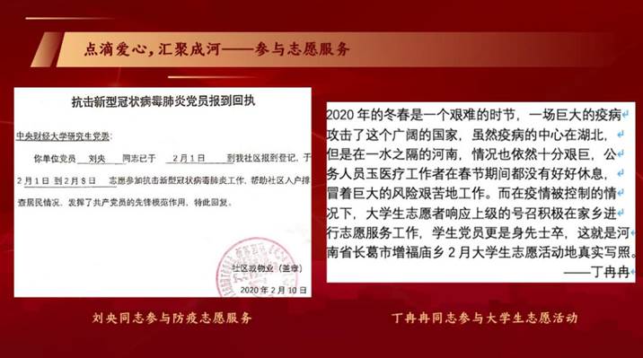 同时,支部鼓励党支部全体学生党员在条件允许,保证自身安全的前提之下,可以自愿参与自己家乡所在社区的各种抗击疫情的志愿活动。支部成员们积极响应党组织的号召,多名党员参与到了社区防疫的第一线,进行路口卡点值守、测量体温、防疫知识宣传等工作,用实际行动诠释了一名共产党员的责任和担当。