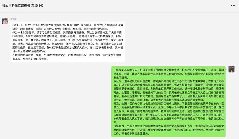 最后,党支部同志们纷纷在线上发表自己的学习心得,大家积极踊跃的发言,既能客观理性地认识当前的疫情现状,又能感情真挚的表达自己对祖国的忠诚和感恩。我们为自己是一位中国人感到骄傲,更为自己是一名共产党人感到自豪!大家纷纷表示,这段时间听党指挥,自觉居家隔离,并起到党员的模范带头作用,做通家人的思想工作,尽自己所能为祖国防疫事业贡献自己的力量。各位同志的学习心得深入透彻,由此可见本次党日学习活动的开展圆满成功。相信社心党支部的同志们定会坚定信念,尽己所能帮助祖国防疫事业取得圆满成功!