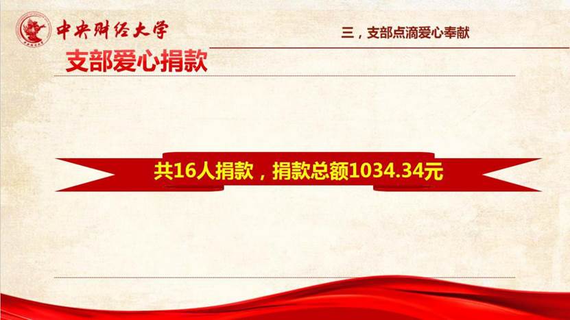 接下来,冯丹老师对支部之前进行的爱心捐助活动进行成果汇报,虽然本支部是几乎零收入的学生支部,但是在自愿的前提下,支部共16人捐款,捐款总额达1034.34元。点滴爱心,汇聚成河,支部成员们的踊跃捐款让每个人的心里流过一股暖流,我们坚信,没有一个冬天不会过去,每一个春天都将如期而至!