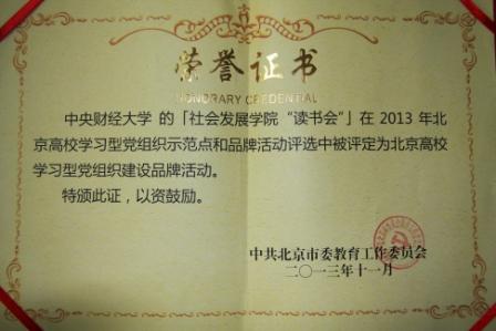 根据北京市学习型党组织建设领导小组关于开展示范点和品牌活动评审的通知,2013年6月,北京市委教育工委开展了北京高校学习型党组织示范点和品牌活动的申报工作,全市共有25所高校申报示范点28个,36所高校申报品牌活动62项;经组织有关专家集中评审,共评出示范点13个,品牌活动26项。我校社会发展学院代表学校参加申报,申报的“读书会”项目,最终荣获北京高校学习型党组织建设品牌活动荣誉称号。