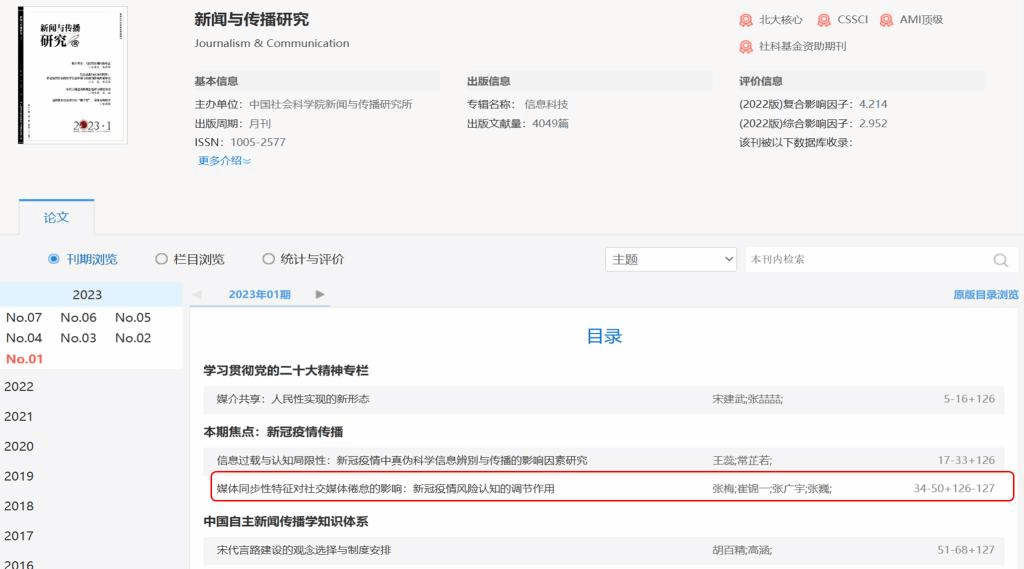 近期,我校BB贝博艾弗森官方网站张梅副教授与信息学院张巍教授、BB贝博艾弗森官方网站本科生崔锦一、张广宇合作撰写的论文《媒体同步性特征对社交媒体倦怠的影响:新冠疫情风险认知的调节作用》在权威学术期刊《新闻与传播研究》上发表。
