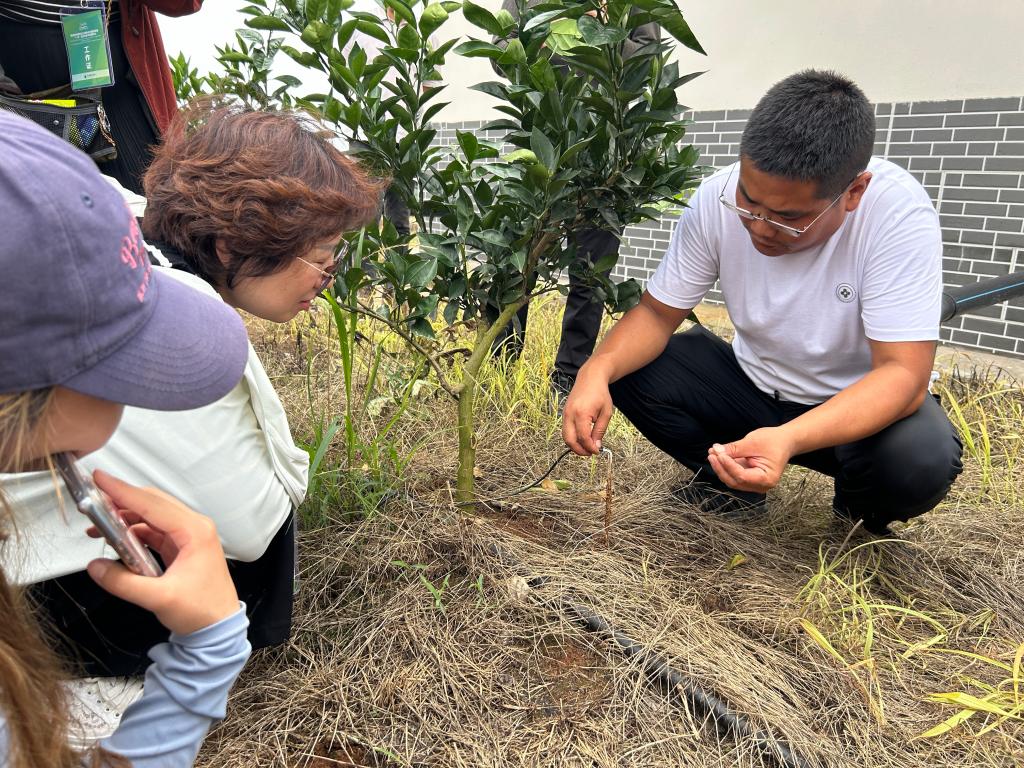 以桂花村为例,村内有标准化道路、太阳能杀虫灯和排水沟渠。此外,田地中还分布着十几个泵站,连接的输水管道配备水肥一体化设施,既可调水又可节水。村监理向团队展示了最新设备,30厘米长的针状管道可直接将水送到果树根部,有效提高用水效率。村民表示,新修的道路可以在二十分钟内直通城镇,平整的土地更便利机械化作业。作为返乡青年,亚行的生态助农项目让他看到了村庄的巨变,看到了产业发展的希望,也看到了新农村的光明前景。