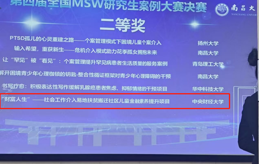 12月14日,第四届全国MSW研究生案例大赛全国总决赛在南昌落幕。贝博“财富人生——社会工作介入易地扶贫搬迁社区儿童进入素养提升项目”案例团队斩获全国二等奖。本次大赛由中国社会工作专业学位研究生教育指导委员会指导,社会工作专业学位研究生教育院校联席会议主办,南昌大学公共政策与管理学院、社会工作教育中心承办。来自168所MSW培养单位的422支队伍,共2110人次研究生参赛,其中40支队伍进入决赛。