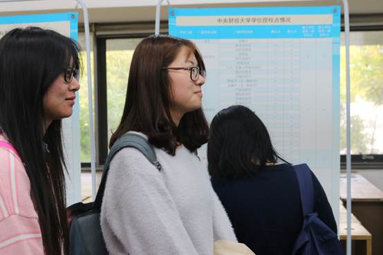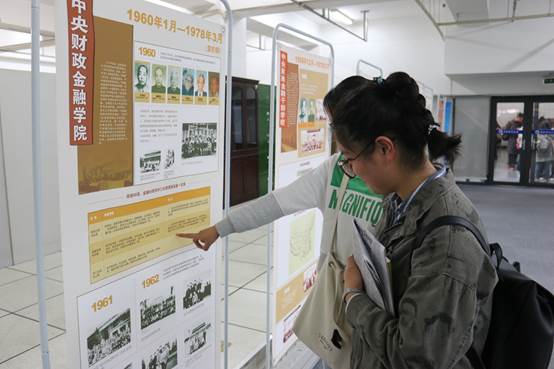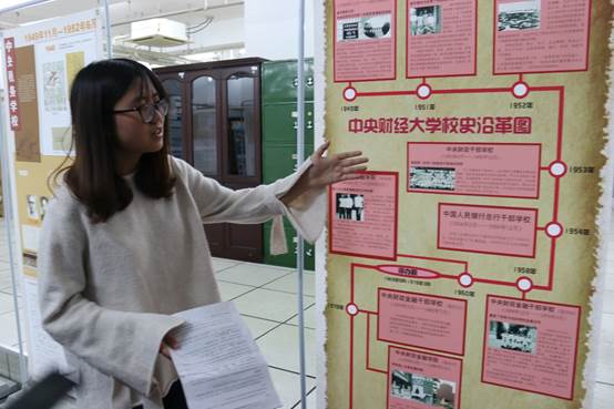 沿着校史馆的边界,顺次摆放着记录中财自建校以来历程的竖幅大图片。为我们解说的是一位亲切的学姐,她先带领我们了解了学校的名称、专业以及行政等方面的变迁。