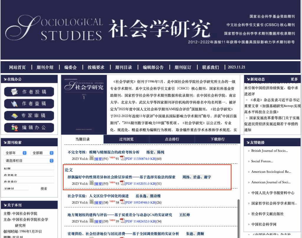 近日,我校BB贝博艾弗森官方网站周扬讲师,与北京大学社会研究中心於嘉助理教授、普林斯顿大学社会学系谢宇教授合作撰写的论文《择偶偏好中的性别差异和社会阶层异质性——基于选择实验法的探索》发表于《社会学研究》2023年第6期。