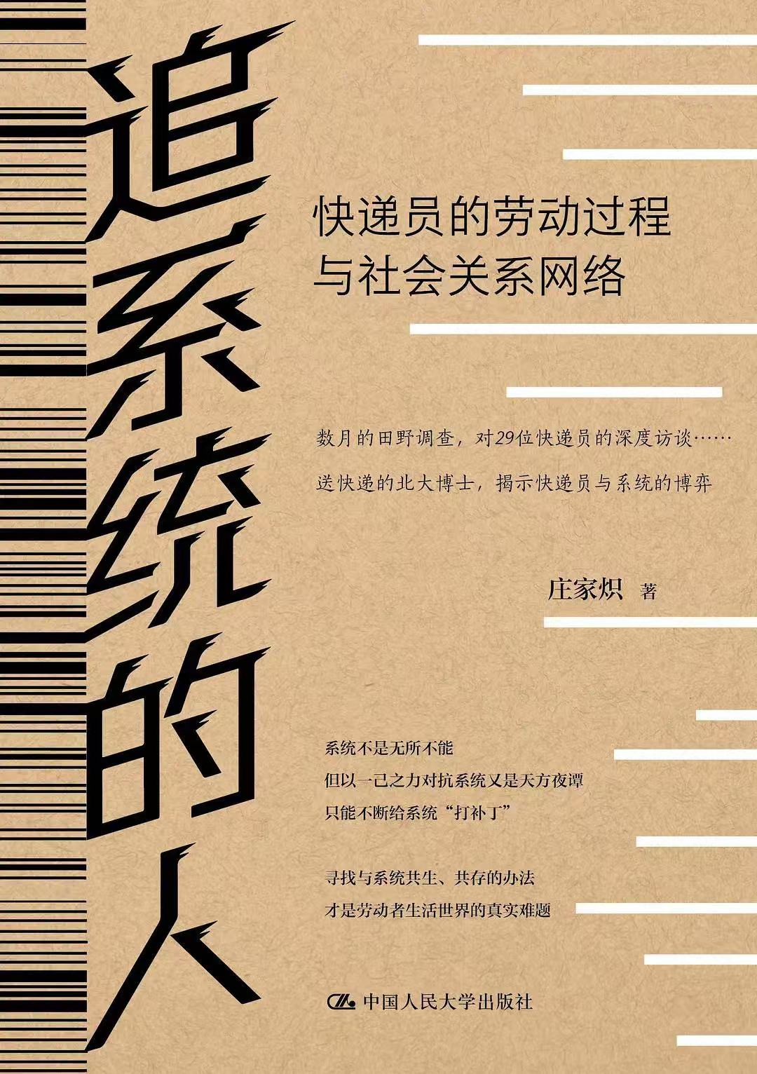 近日,BB贝博艾弗森官方网站副教授庄家炽的学术专著《追系统的人:快递工人劳动过程与社会关系网络》由中国人民大学出版社出版。本书系BB贝博艾弗森官方网站2023年度学术专著出版资助项目的成果,聚焦快递工人的工作过程与社会关系,为理解数字平台经济下的劳动模式提供了重要的学术视角。作者采用参与式观察法,以历时4个月的沉浸式田野调查为基础,通过与快递工人同吃同住同劳动的方式,解码快递工人具体的劳动和生产过程,深度剖析中国400万快递从业者的生存图景。